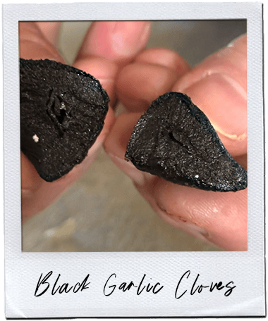 Black Garlic is regular garlic that has been fermented for a month, changing the consistency into that of a date. The black garlic cloves have a sweet taste. Compared to raw garlic, it contains far more antioxidants, more fiber and protein, and is easier to digest.